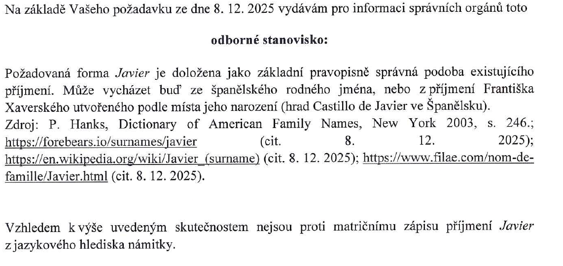 Chtějí odborný posudek. Příjmení Javier mi zatím neschválí.